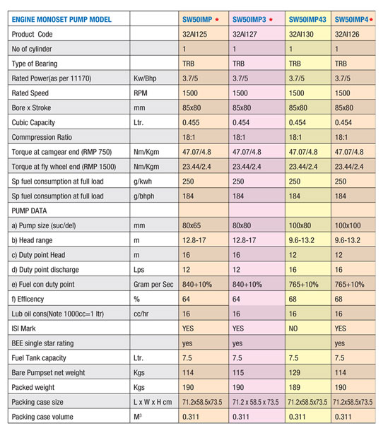 SW 50IMP4 MONO SET : 5 HP DIESEL ENGINE, BEE STAR RATING CERTIFIED ENGINE, 1500 RPM ENGINE, 85mm BORE, STROKE 80MM, HEAD RANGE : 12.8 TO 17.6, DISCHARGE IN LPS 22,